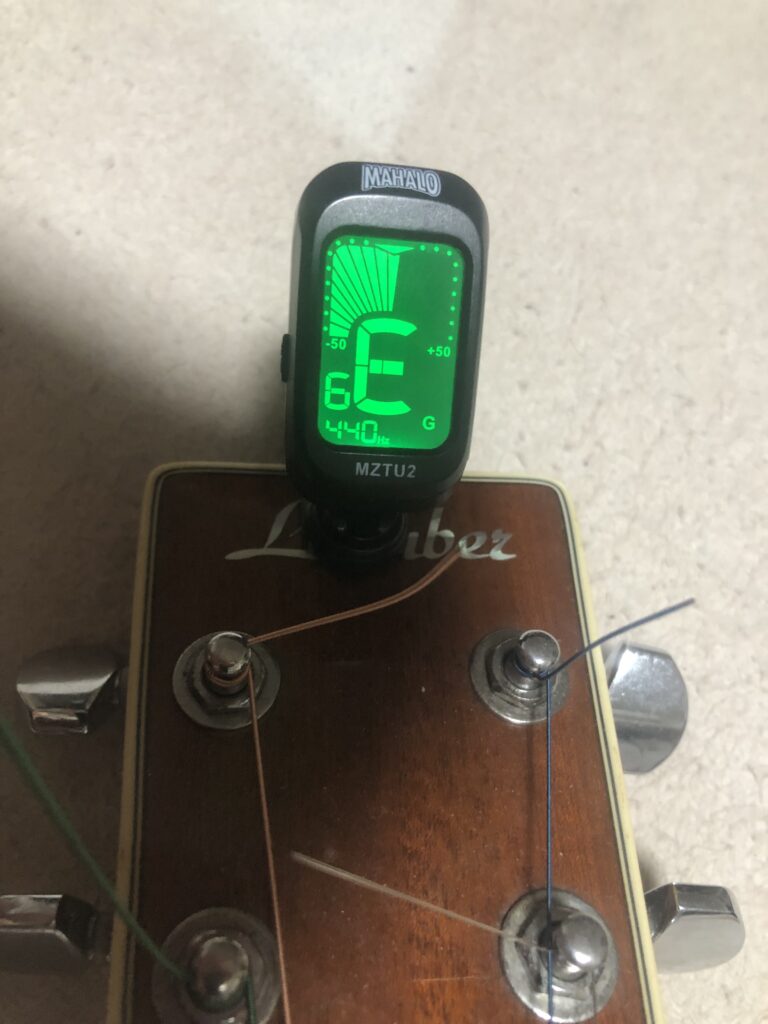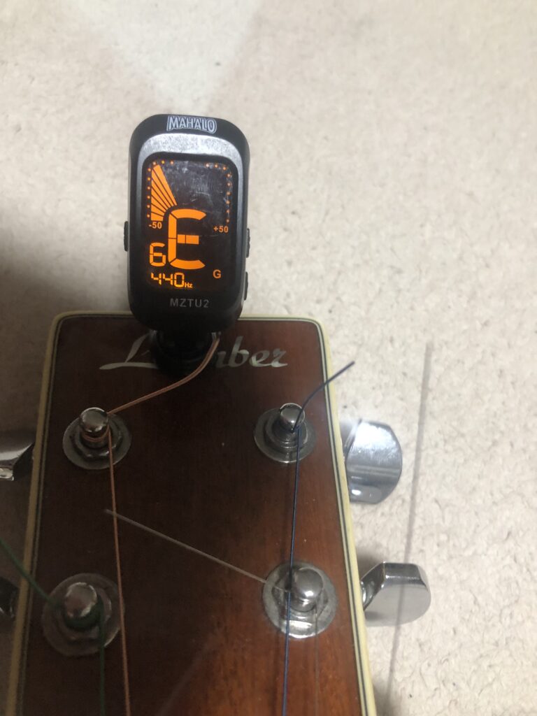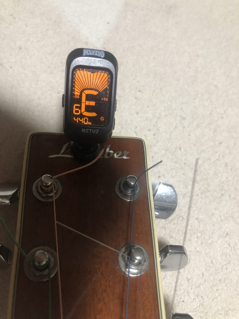 やり方はシンプルで下のようにギターにチューナーをつけて、一本ずつ弦を弾いて、音を合わせていきます。